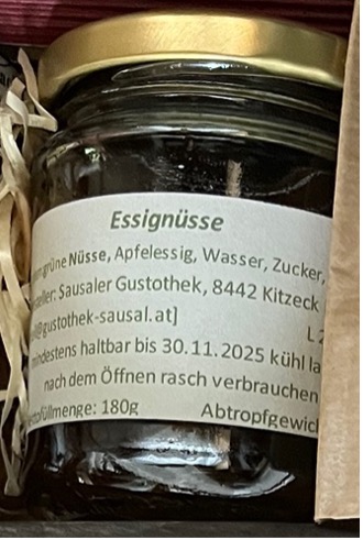Unsere Essignüsse sind eine feine Rarität: junge Walnüsse werden früh geerntet, sorgfältig eingelegt und mit Essig und Gewürzen veredelt. Dabei entsteht ein süß-sauer-würziger Geschmack, der einzigartig und überraschend ist. Früher galten sie als Delikatesse auf feinen Tafeln – heute erleben sie ein köstliches Comeback. Besonders gut harmonieren sie mit kräftigem Käse, Wild oder Braten. Mit viel Geduld hergestellt, sind sie ein Stück gelebter Tradition. Ein Genuss, der überrascht und begeistert.